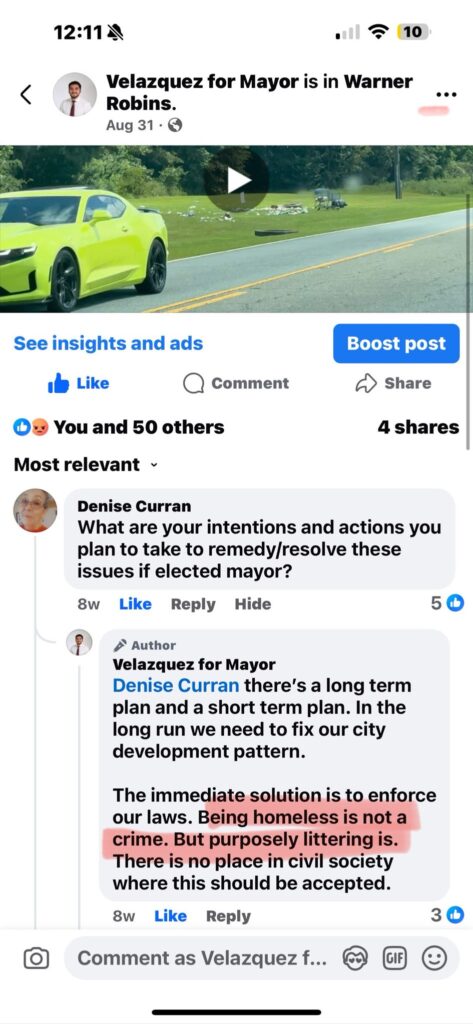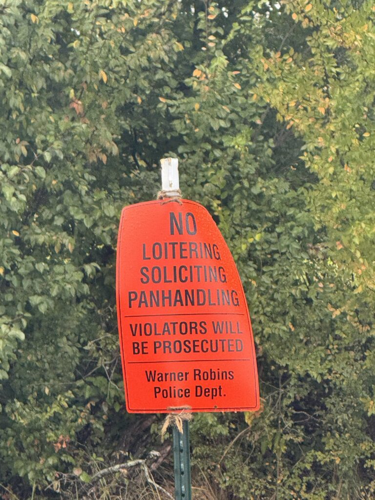 And here’s the irony: while the establishment paints Fabian as heartless toward the homeless, a simple drive around War–Town tells a different story. Signs everywhere read, “No loitering, soliciting, or panhandling. Violators will be prosecuted.” Those signs bear the seal of the Warner Robins Police Department — which takes its marching orders from the mayor and council. If compassion is the standard, maybe the folks criminalizing poverty shouldn’t be the ones pointing fingers.